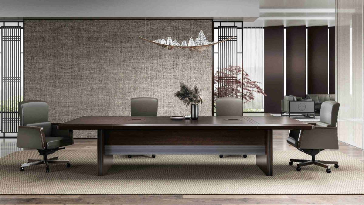 烏金木の自然な木目の質感と棕紅色の稳重大気な色調を融合させ、新中式スタイルの独特な美学を充分に体现します。烏金木は高級感のある木目を持ち、温かみがあり、棕紅色は伝統的な韻律を醸し出し、両者を組み合わせることで、企業の稳重大気なイメージを高め、会議室の格調を向上させます。色調が落ち着いているため、長期使用でも色褪せしにくく、雰囲気を維持します。